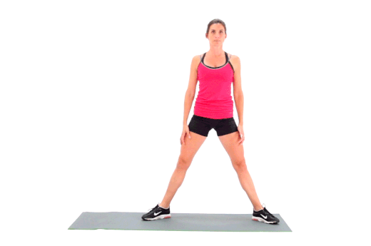 - Start standing with feet shoulder-width apart and toes pointing slightly outward.