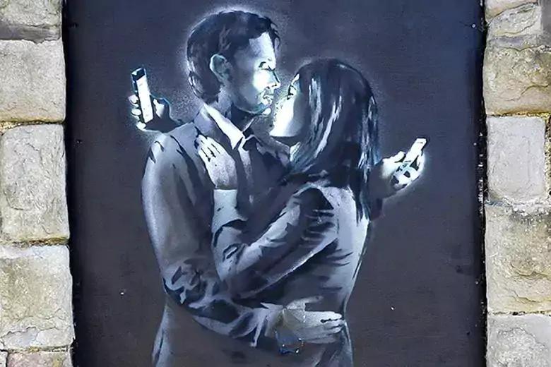 La obra presenta a dos amantes besándose apasionadamente mientras miran sus teléfonos móviles en lugar de mirarse el uno al otro. La imagen es una crítica irónica al uso excesivo de la tecnología y a cómo las personas pueden estar más conectadas a sus dispositivos que a las personas que están a su alrededor.