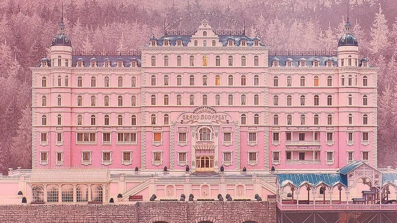 Pasteles nostálgicos en The Grand Budapest Hotel: Tonos rosados y amarillos suaves que evocan un tiempo perdido lleno de glamour.